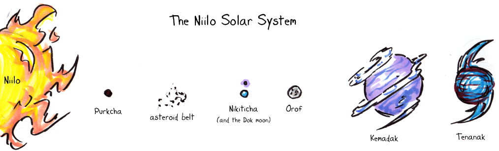 Nikiticha is in the Niilo system, three fourths of the way down a spiral arm of the Milky Way Galaxy. Nikiticha is the second planet from its sun in the Niilo system and one of only three terrestrial planets in the system - the other two being gas giants.