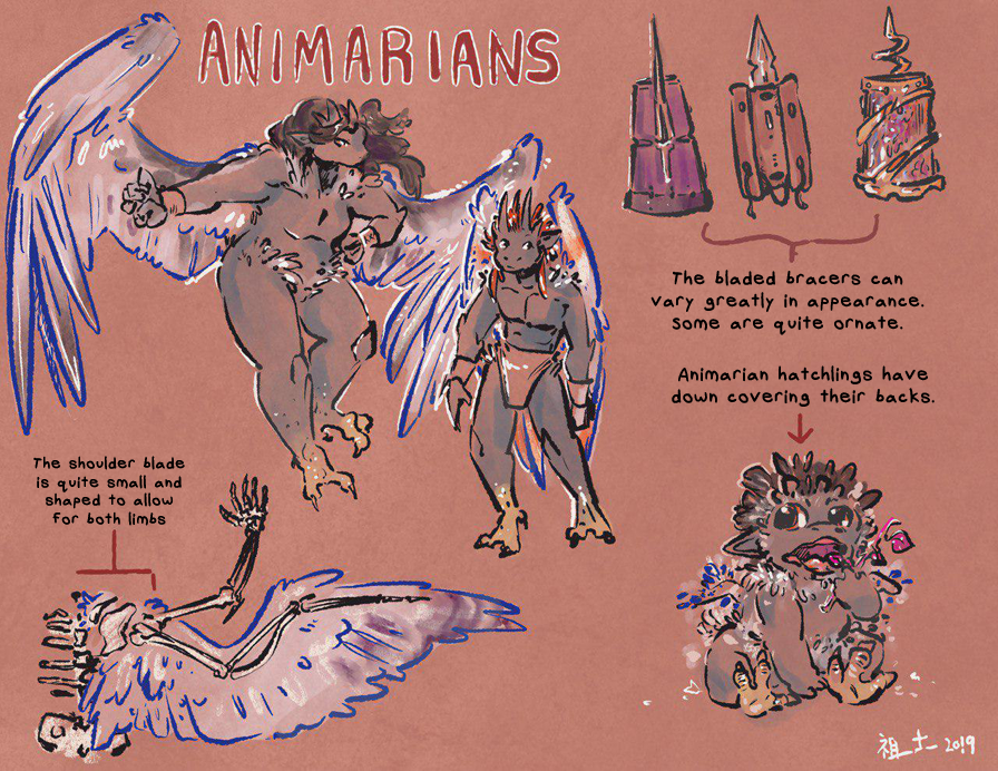 Never the less, the Animarian bladed bracer is omnipresent in each and every clan - a traditional tool which can double as a weapon and is gifted to a child by their community shortly after their first flight. An Animarian will go through many bracers in their lifetime and may keep several for different purposes. At its most basic, the bracer aids the fairly large Animarians in finding or making purchase on the world's ancient trees.