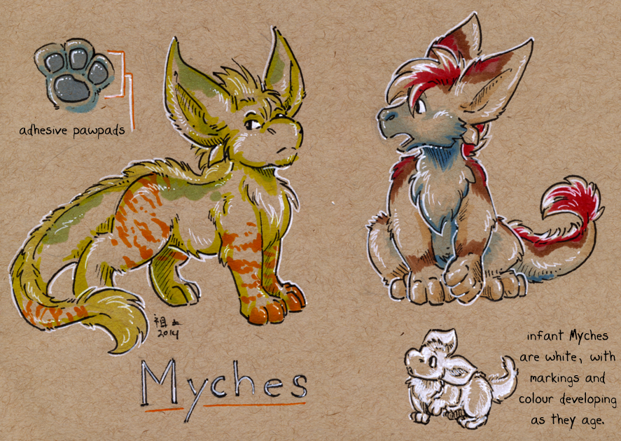 Infant Myches are born with pure white fur, and no markings. As they age, their markings and fur colours begin to develop and continue to darken as they grow older. Although rare, some Myches remain white-coated into adulthood. This genetic abnormality has yet to be explained, but culturally, Myches treat these individuals as children well into their adult years.
