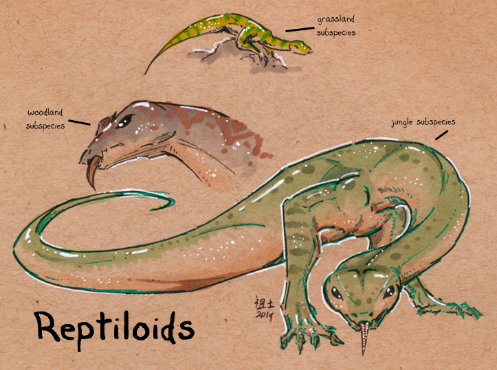 There are numerous Reptiloid subspecies can all inter-breed, but each subspecies is patterned with unique markings for camouflage in their native climate. This, of course, aids in their hunting. Different subspecies rarely hunt outside their home region, however, as they become easy prey for other Reptiloids more equipped to hide and hunt in the strange terrain.