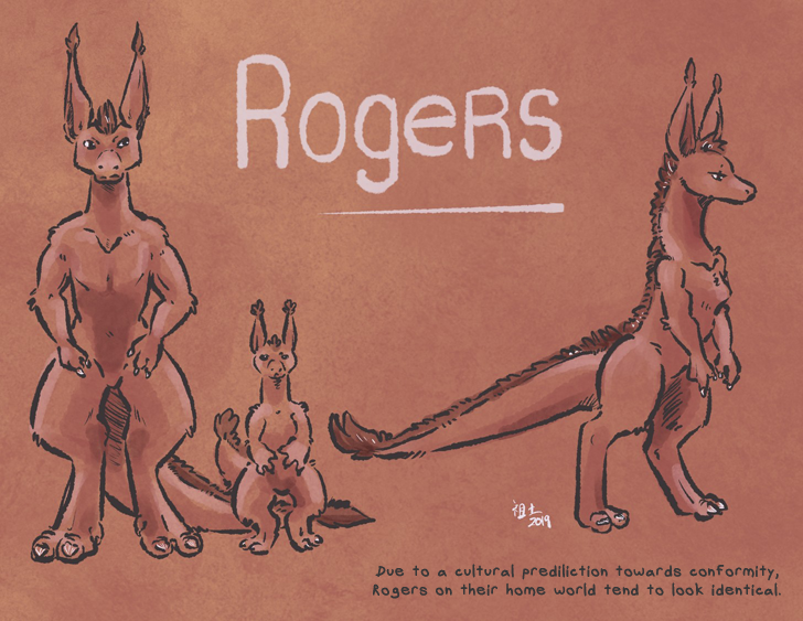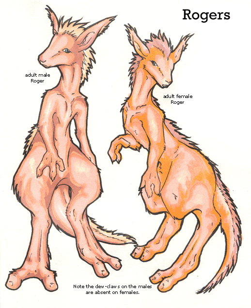 Rogers were originally distance runners on the flat planes of Rojeria and their tough two-toed feet adapted for this. Rogers rarely hop or jump, except at a very young age. Their muzzles are long and thin, housing a dental structure of an omnivore with a prediliction toward grinding plant matter. Rogers must gather nutrition from numerous indigenous sources on Roger in order to remain healthy - but the modern Roger living on Rojeria prefers a balanced nutrient stick which resembles an ugly sausage and is produced on-planet.