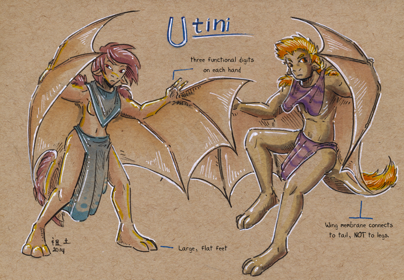 Utini are pure mammalian avians of more or less humanoid physiology. They are easily identified by their large wing membranes, which are clearly evolved from a five-fingered hand structure. Two of the Utini's digits function to manipulate their wing membrane, with a third support spine extending from the ulna for flight stabilization. This leaves two functioning humanoid fingers and a thumb on the Utini hand.