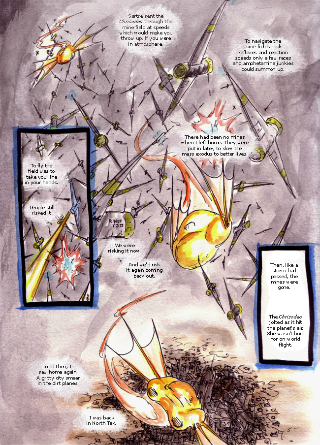 Sartre sent the Chrisodeo through the mine field at speeds which would make you throw up, if you were in atmosphere. To navigate the mine fields took reflexes and reaction speeds only a few races and amphetamine junkies could summon up. There had been no mines when I left home. They were put in later, to slow the mass exodus to better lives. To fly the field was to take your life in your hands. People still risked it. We’re risking it now. And we’d risk it again coming back out. Then, like a storm had passed, the mines were gone. The Chrisodeo jolted as it hit the planet’s air. She wasn’t built for on-world flight. And then, I saw home again. A gritty city smear in the dirt planes. I was back in North Tek.