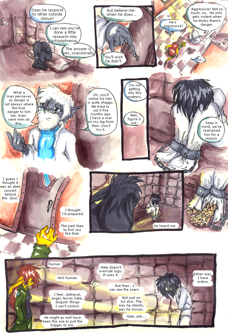 Lypha (thinking): I guess I thought it was an alien convert behind the door. I thought I’d prepared. The past likes to fool you like that. He heard me. Human. He’s human. I feel…betrayal, anger, terror, hate, disgust- things I can’t control. He might as well have been the one to pull the trigger, to me. Hate doesn’t overrule logic, it uses it. But then… I see the scars. Not just on his skin. The way he stands, the way he moves. Hate, pity…