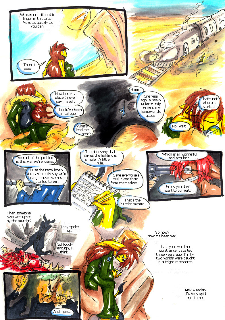 Lypha: …There it goes. Now here’s a place I never saw myself. I should have been in college. What’s led me here? Hmm. One year ago, a heavy Rulerist ship entered my homeworld’s space- No, wait. That’s not where it started. The root of the problem is this war we’re losing. I use the term loosly. You can’t really say we’re losing, cause we never started to win. The philosophy that drives the fighting is simple. A little rule. “Save everyone’s soul. Save them from themselves.” That’s the Rulerist mantra. Which is all wonderful and altruistic. Unless you don’t want to convert.