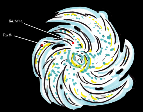 Nikiticha is in the Niilo system, three fourths of the way down a spiral arm of the Milky Way Galaxy. Nikiticha is the second planet from its sun in the Niilo system and one of only three terrestrial planets in the system - the other two being gas giants.