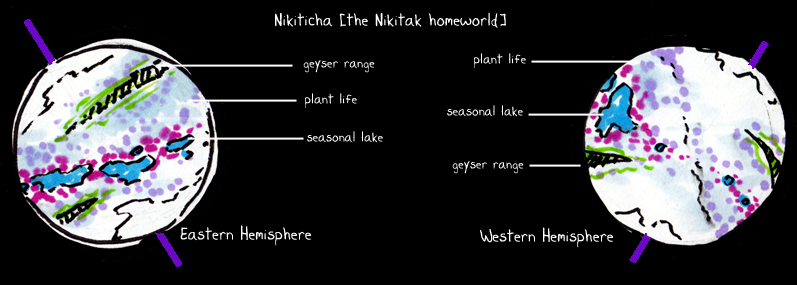 While the poles of the planet are too cold for most species to inhabit, Nikitaks find them tolerable. The majority of settlements on Nikiticha, however, populate the tropics.