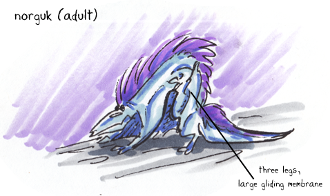 The gliding mammal known as the norguk builds its nests in trees. Norguk adults are particularly aggressive, but immature norguk are considered a delicacy. A norguk is about the size of a grown human's fore-arm, but fights viciously when provoked. It is considered unwise to hunt norguk without being properly trained.