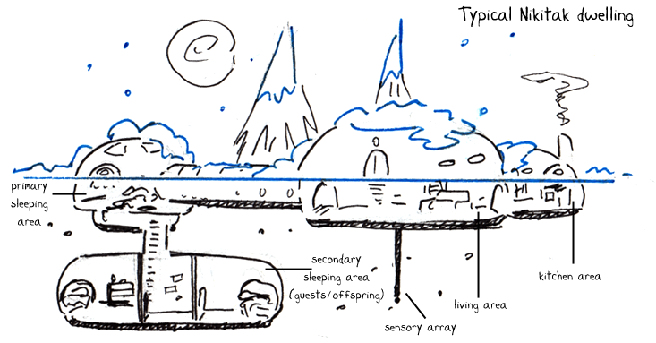 However, the majority of the Nikitak building structure is not below the surface but beneath it. Nikitak cities, homes and towns are burrow-like, with many causeways, passages and rooms all beneath the surface. This works in their favour for preserving heat, and towards their social nature. If there is a new member to the family or a new guest, a new room is excavated on the spot. Typically, adults take the room closest to the surface for safety purposes.