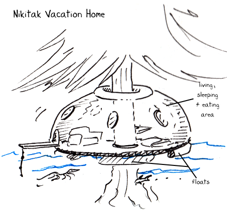Near the equator, Nikitak homes are above-ground and smaller. They are built around either the base of a tree or the base of a secured metal pole, and bouyed on the underside. These homes rise as the ice begins to melt and fill the lakebeds, and so are in a way 'tropical' get-aways. Nikitaks rarely live in these locations year-round. Due to the temporary nature of the lakes, it is safe to swim in them - as opposed to any oceanic cracks which may open in the ice sheet.